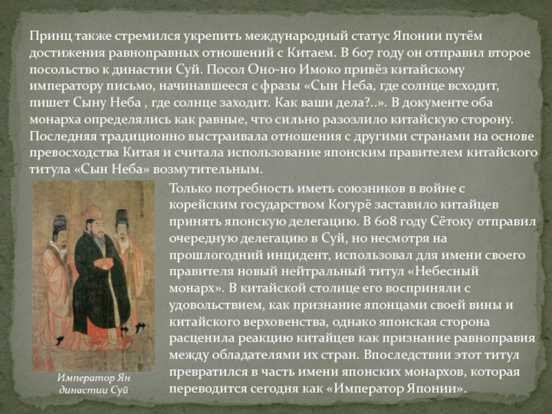 Только потребность иметь союзников в войне с корейским государством Когурё заставило китайцев принять японскую делегацию. В 608 году Сётоку отправил очередную делегацию в Суй, но несмотря на прошлогодний инцидент, использовал для имени своего правителя новый нейтральный титул «Небесный монарх». В китайской столице его восприняли с удовольствием, как признание японцами своей вины и китайского верховенства, однако японская сторона расценила реакцию китайцев как признание равноправия между обладателями их стран. Впоследствии этот титул превратился в часть имени японских монархов, которая переводится сегодня как «Император Японии».