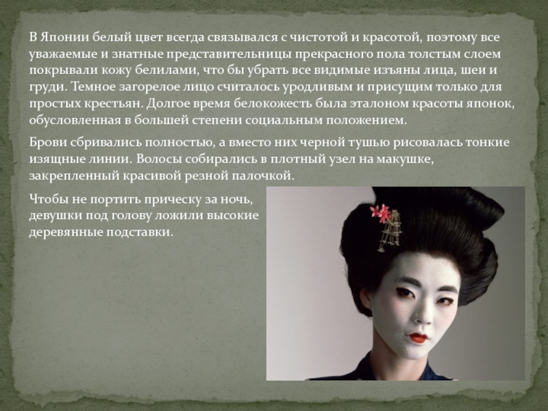 Брови сбривались полностью, а вместо них черной тушью рисовалась тонкие изящные линии. Волосы собирались в плотный узел на макушке, закрепленный красивой резной палочкой.