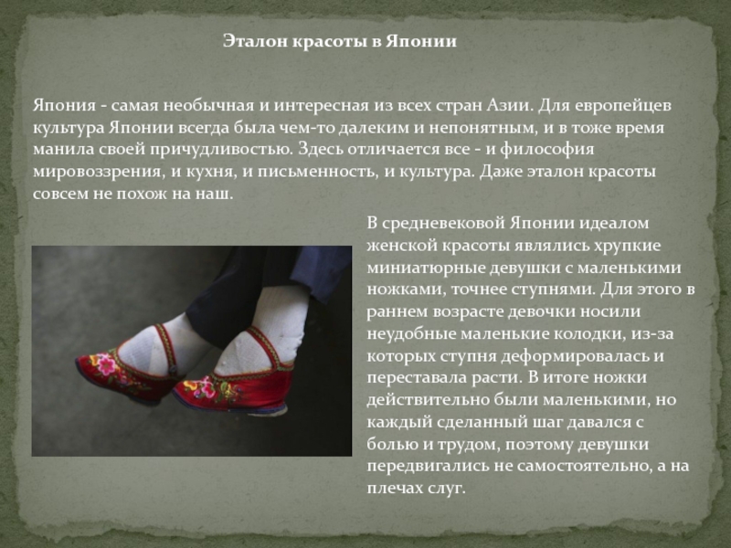 В средневековой Японии идеалом женской красоты являлись хрупкие миниатюрные девушки с маленькими ножками, точнее ступнями. Для этого в раннем возрасте девочки носили неудобные маленькие колодки, из-за которых ступня деформировалась и переставала расти. В итоге ножки действительно были маленькими, но каждый сделанный шаг давался с болью и трудом, поэтому девушки передвигались не самостоятельно, а на плечах слуг.