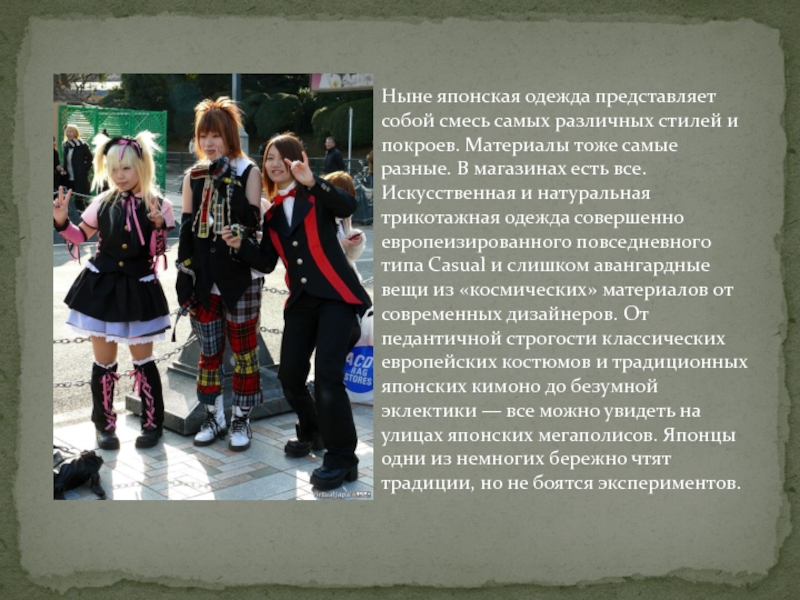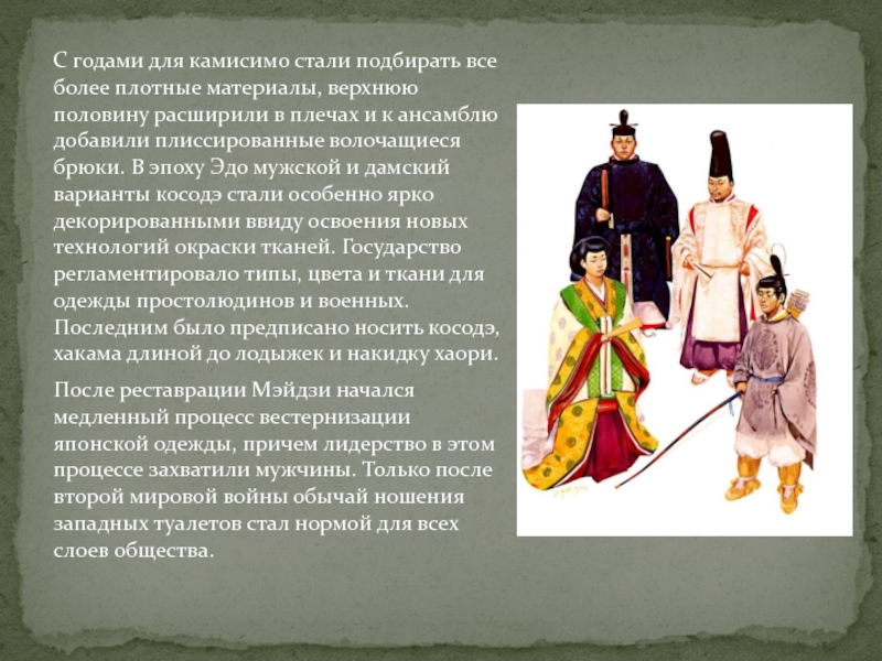 После реставрации Мэйдзи начался медленный процесс вестернизации японской одежды, причем лидерство в этом процессе захватили мужчины. Только после второй мировой войны обычай ношения западных туалетов стал нормой для всех слоев общества.