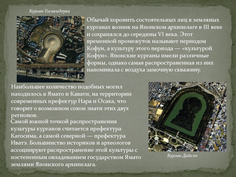 Самой южной точкой распространения культуры курганов считается префектура Кагосима, а самой северной — префектура Иватэ. Большинство историков и археологов ассоциируют распространение этой культуры с постепенным овладеванием государством Ямато землями Японского архипелага.