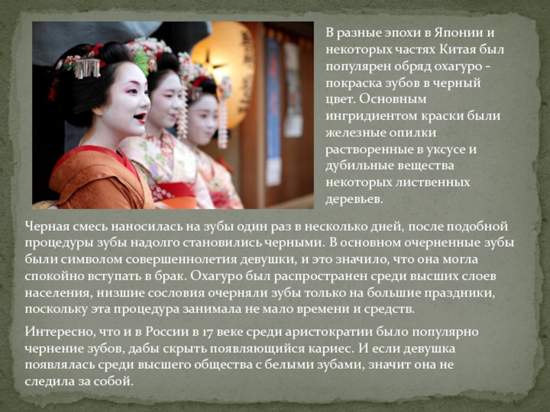 Интересно, что и в России в 17 веке среди аристократии было популярно чернение зубов, дабы скрыть появляющийся кариес. И если девушка появлялась среди высшего общества с белыми зубами, значит она не следила за собой.