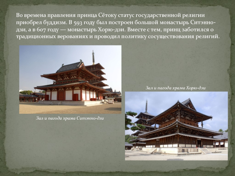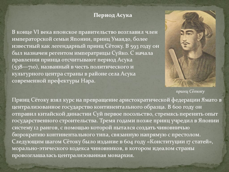 Принц Сётоку взял курс на превращение аристократической федерации Ямато в централизованное государство континентального образца. В 600 году он отправил китайской династии Суй первое посольство, стремясь перенять опыт государственного строительства. Тремя годами позже принц учредил в Японии систему 12 рангов, с помощью которой пытался создать чиновничью бюрократию континентального типа, связанную напрямую с престолом. Следующим шагом Сётоку было издание в 604 году «Конституции 17 статей», морально-этического кодекса чиновников, в котором идеалом страны провозглашалась централизованная монархия.