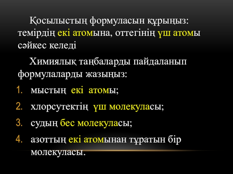 Қосылыстың формуласын құрыңыз: темірдің екі атомына, оттегінің үш атомы сәйкес келеді 	Химиялық таңбаларды пайдаланып формулаларды жазыңыз: мыстың