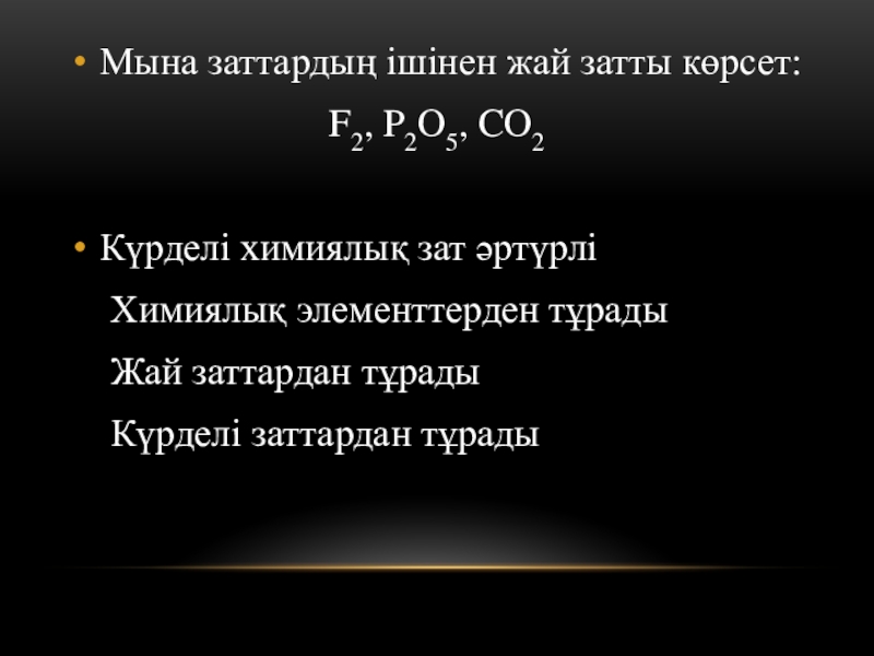 Слайд 10Мына заттардың ішінен жай затты көрсет: