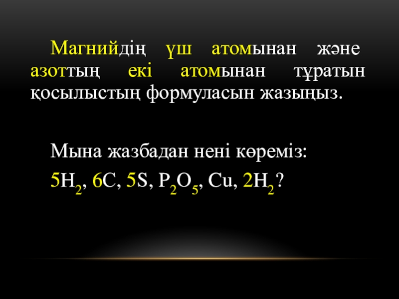 Магнийдің үш атомынан және азоттың екі атомынан тұратын қосылыстың формуласын жазыңыз.	Мына жазбадан нені көреміз: 	5H2, 6С, 5S,