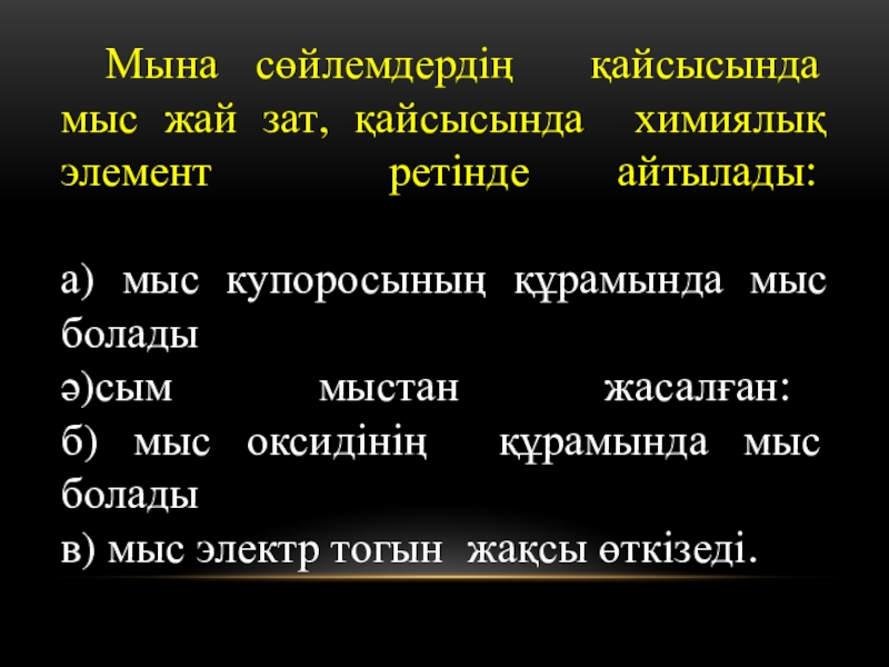 Слайд 5 Мына сөйлемдердің қайсысында мыс жай зат, қайсысында химиялық элемент ретінде айтылады:
