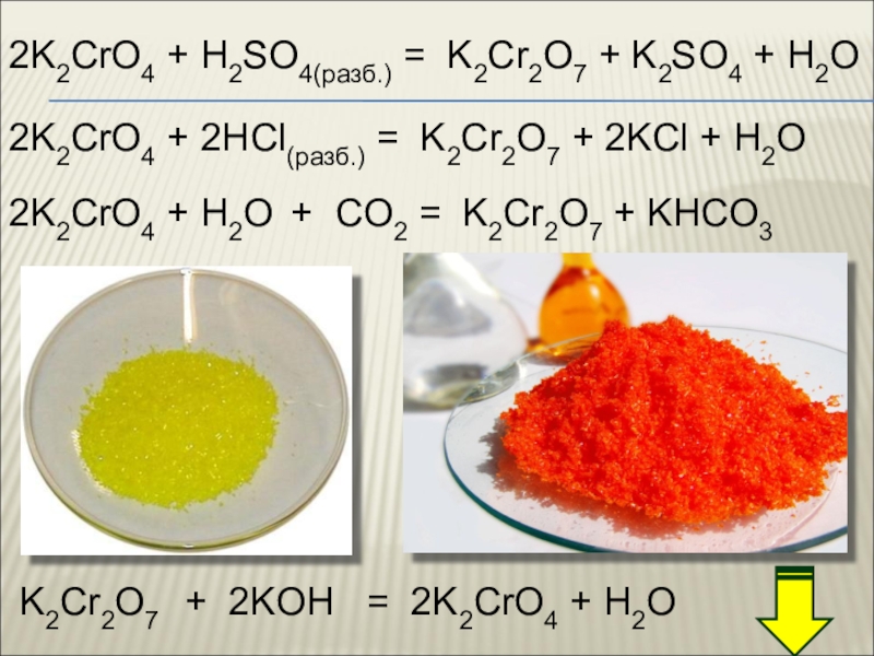 2K2CrO4 + 2HCl(разб.) = K2Cr2O7 + 2KCl + H2O