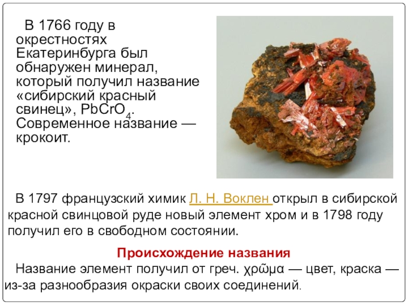 В 1797 французский химик Л. Н. Воклен открыл в сибирской