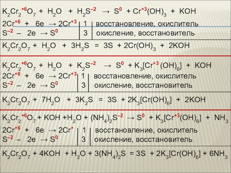 K2Cr2+6O7 + H2O + K2S–2 → S0 + K3[Cr+3 (OH)6] + KOH