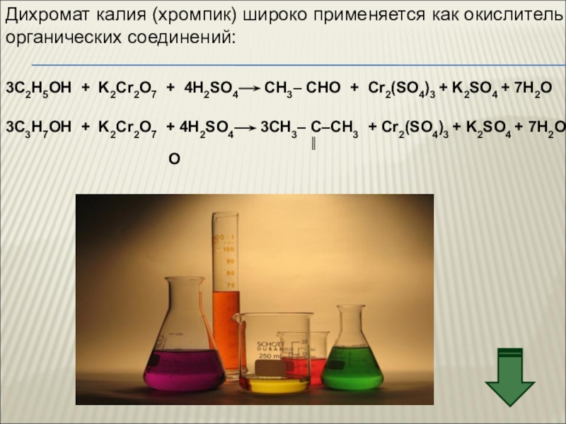 3С3H7OH + K2Cr2O7 + 4H2SO4 3CH3– C–CH3 + Cr2(SO4)3 + K2SO4 + 7H2O
