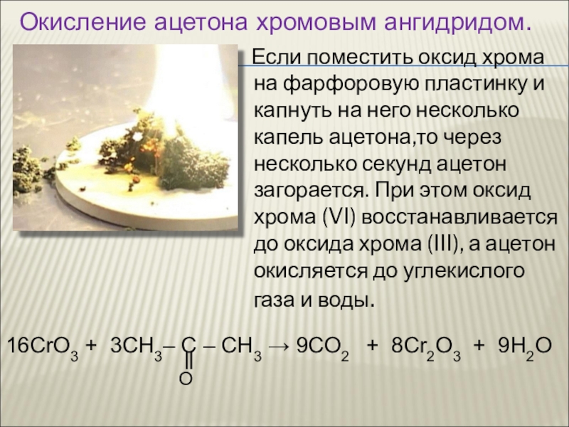 16CrO3 + 3CH3– С – CH3 → 9CO2 + 8Cr2O3 + 9H2O