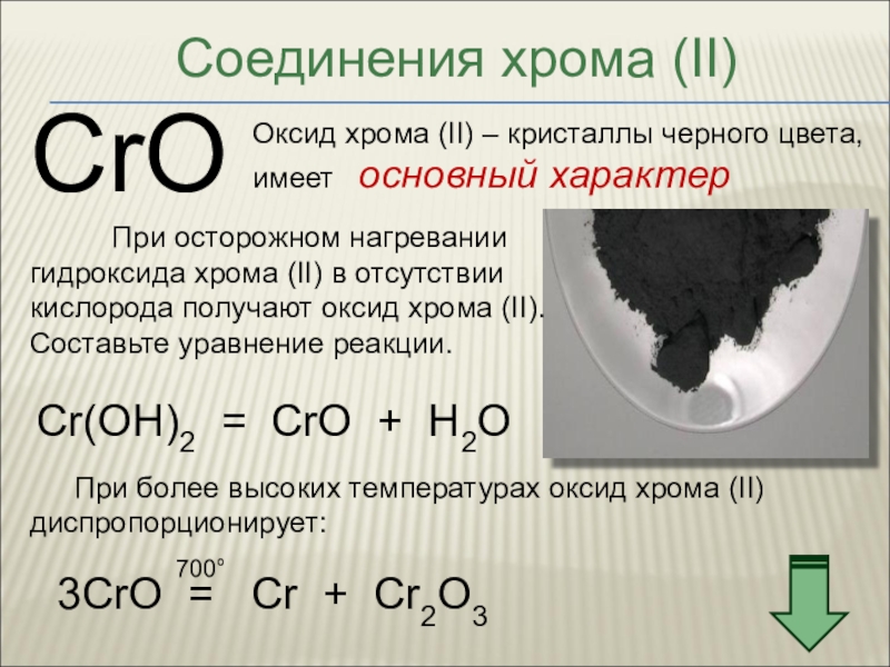 гидроксида хрома (II) в отсутствии кислорода получают оксид хрома (II). Составьте уравнение реакции.