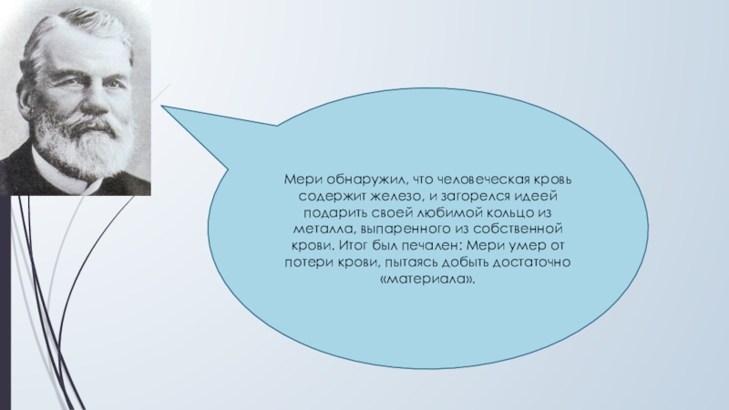 Слайд 13Мери обнаружил, что человеческая кровь содержит железо, и загорелся идеей подарить