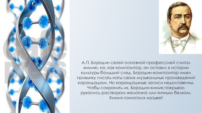 оставил в истории культуры больший след. Бородин-композитор имел привычку писать ноты своих музыкальных произведений карандашом. Но карандашные записи недолговечны. Чтобы сохранить их, Бородин-химик покрывал рукопись раствором желатина или яичным белком. Химия помогала музыке!