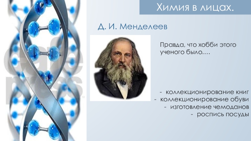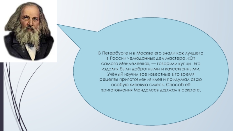 чемоданных дел мастера. «От самого Менделеева», — говорили купцы. Его изделия были добротными и качественными. Учёный изучил все известные в то время рецепты приготовления клея и придумал свою особую клеевую смесь. Способ её приготовления Менделеев держал в секрете.