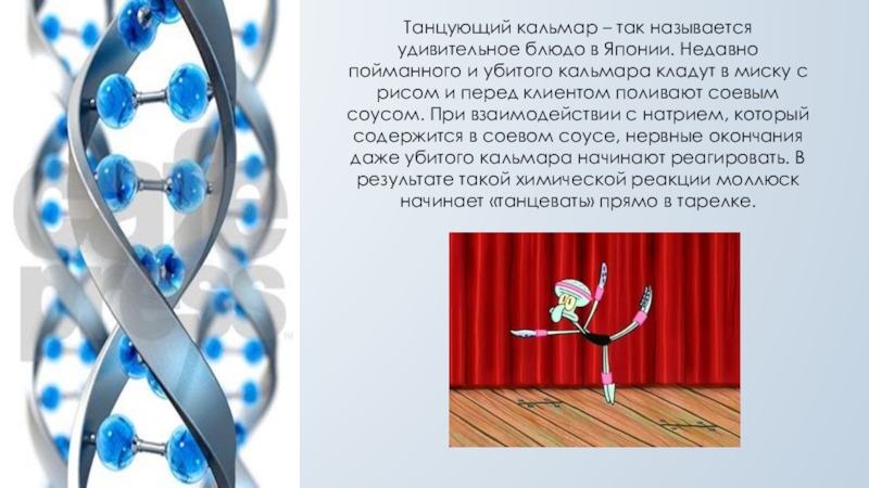 Слайд 27Танцующий кальмар – так называется удивительное блюдо в Японии. Недавно пойманного