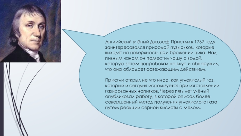 Слайд 5Английский учёный Джозеф Пристли в 1767 году заинтересовался природой пузырьков, которые