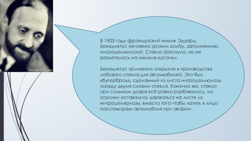 Слайд 7В 1903 году французский химик Эдуард Бенедиктус нечаянно уронил колбу, заполненную