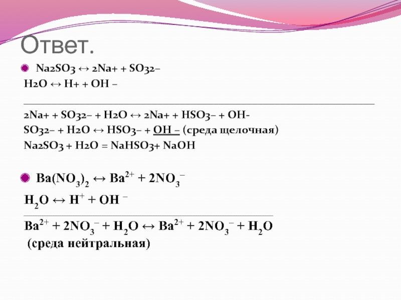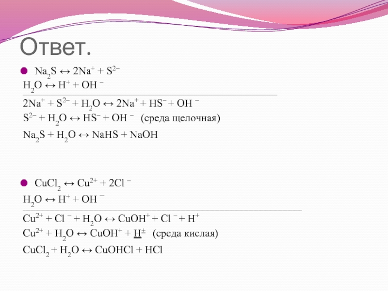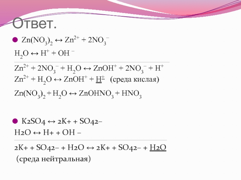 Zn2+ + Н2O ↔ ZnOН+ + Н+ (среда кислая)