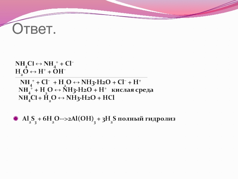 NH4+ + Сl– + Н2O ↔ NH3·H2О + Сl– + Н+