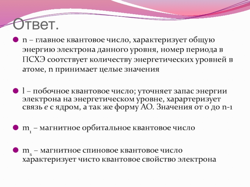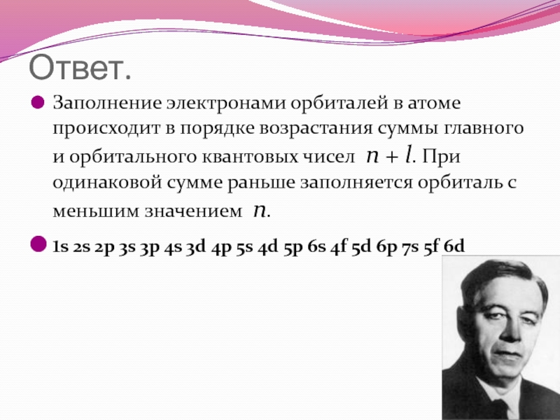 главного и орбитального квантовых чисел n + l. При одинаковой сумме раньше заполняется орбиталь с меньшим значением n.