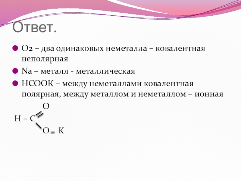 HCOOК – между неметаллами ковалентная полярная, между металлом и неметаллом – ионная