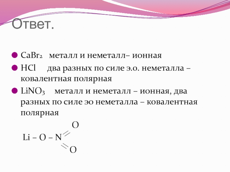 LiNO3 металл и неметалл – ионная, два разных по силе эо неметалла – ковалентная полярная
