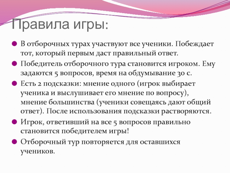 Игрок, ответивший на все 5 вопросов правильно становится победителем игры!