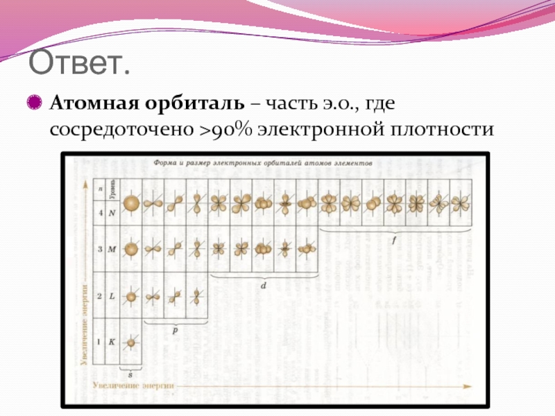 Атомная орбиталь – часть э.о., где сосредоточено >90% электронной плотности