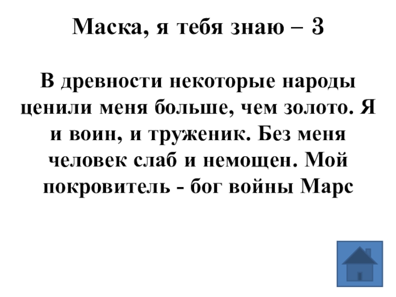 меня больше, чем золото. Я и воин, и труженик. Без меня человек слаб и немощен. Мой покровитель - бог войны Марс
