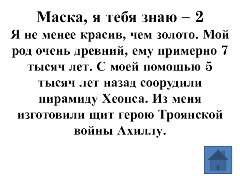 золото. Мой род очень древний, ему примерно 7 тысяч лет. С моей помощью 5 тысяч лет назад соорудили пирамиду Хеопса. Из меня изготовили щит герою Троянской войны Ахиллу.
