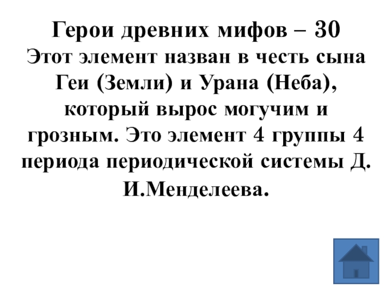 (Земли) и Урана (Неба), который вырос могучим и грозным. Это элемент 4 группы 4 периода периодической системы Д.И.Менделеева.
