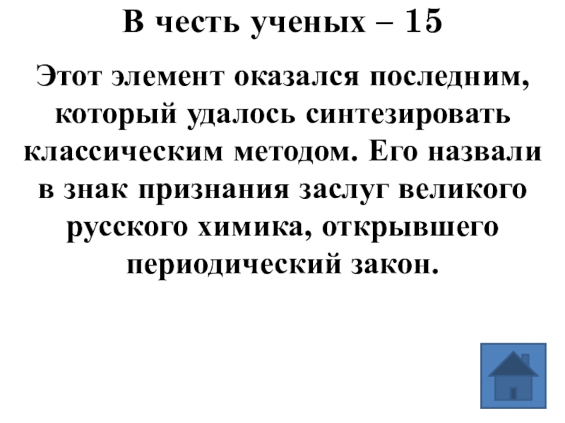классическим методом. Его назвали в знак признания заслуг великого русского химика, открывшего периодический закон.