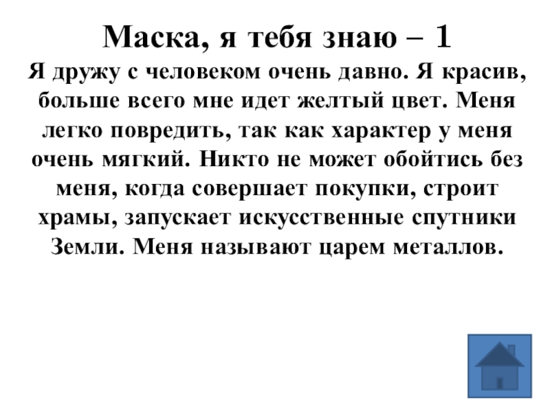 давно. Я красив, больше всего мне идет желтый цвет. Меня легко повредить, так как характер у меня очень мягкий. Никто не может обойтись без меня, когда совершает покупки, строит храмы, запускает искусственные спутники Земли. Меня называют царем металлов.