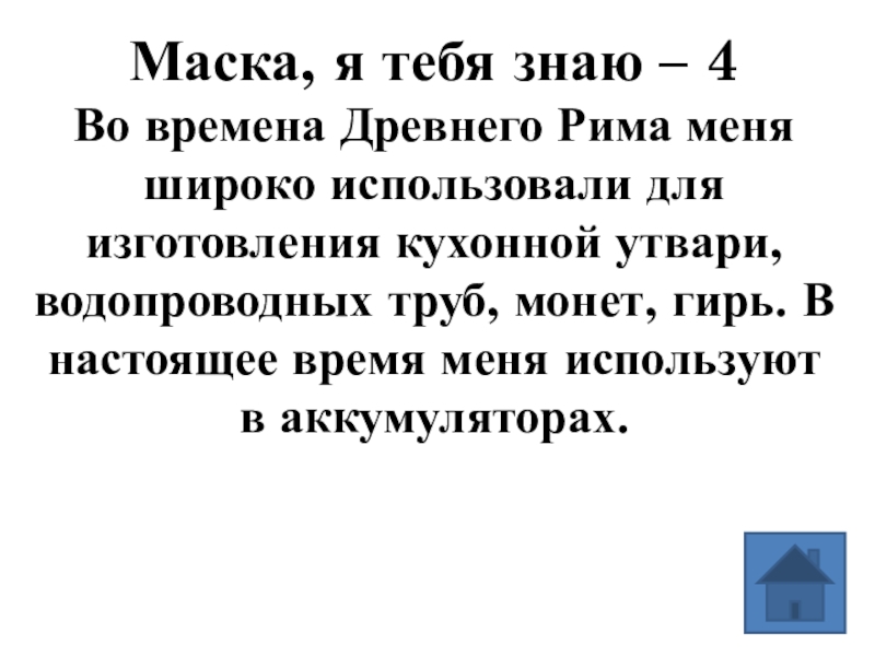 широко использовали для изготовления кухонной утвари, водопроводных труб, монет, гирь. В настоящее время меня используют в аккумуляторах.
