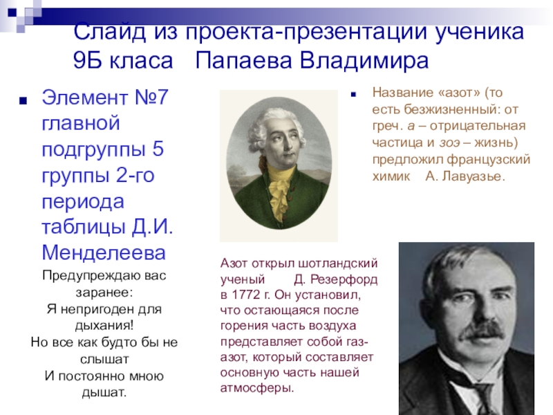 Название «азот» (то есть безжизненный: от греч. а – отрицательная частица и зоэ – жизнь) предложил французский химик А. Лавуазье.