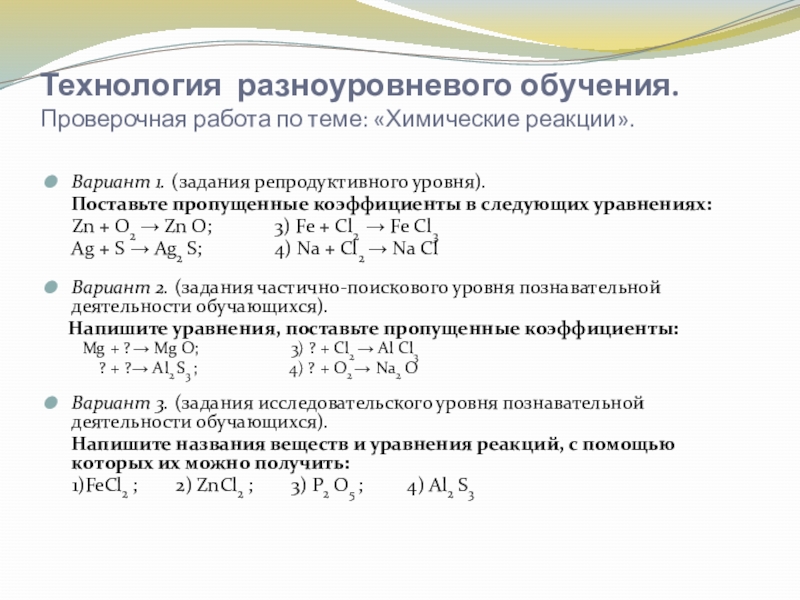 Zn + O2 → Zn O; 3) Fe + Cl2 → Fe Cl3