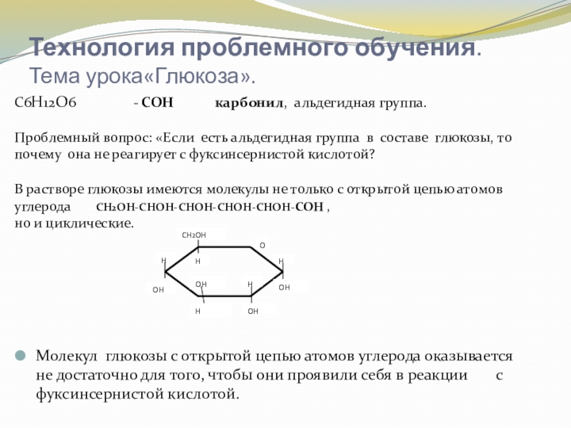 Проблемный вопрос: «Если есть альдегидная группа в составе глюкозы, то почему она не реагирует с фуксинсернистой кислотой?