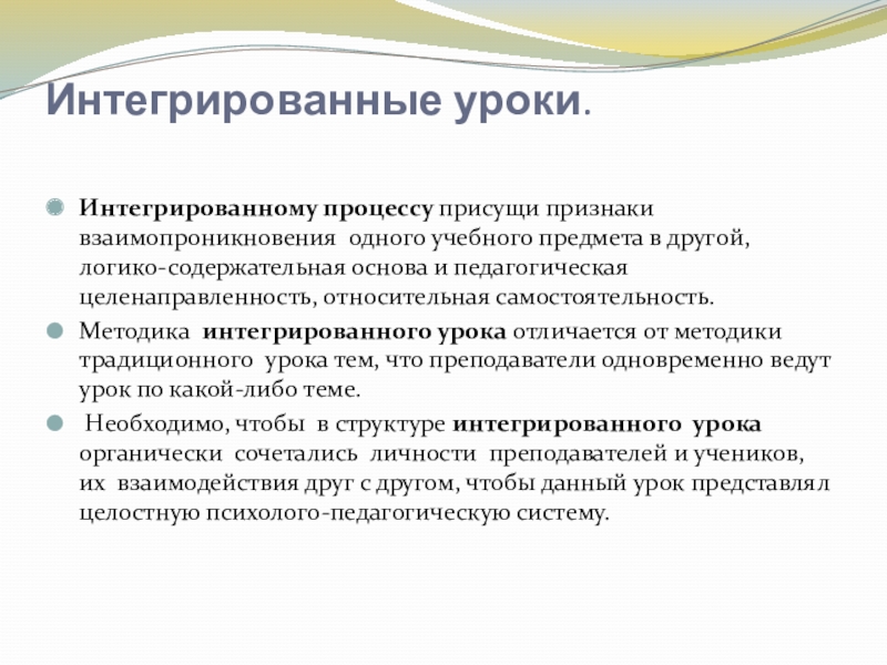 Интегрированному процессу присущи признаки взаимопроникновения одного учебного предмета в другой,