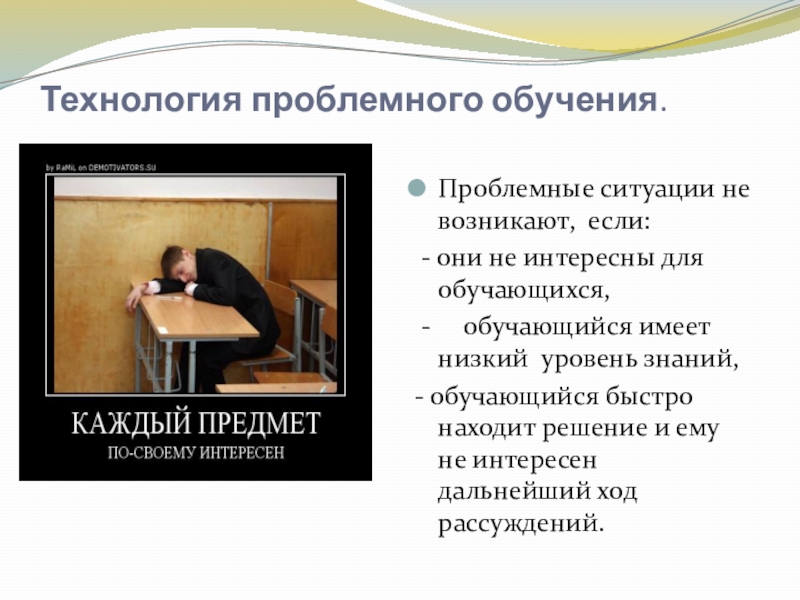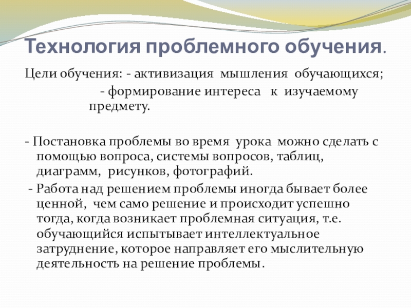 - Работа над решением проблемы иногда бывает более ценной, чем само решение и происходит успешно тогда, когда возникает проблемная ситуация, т.е. обучающийся испытывает интеллектуальное затруднение, которое направляет его мыслительную деятельность на решение проблемы.
