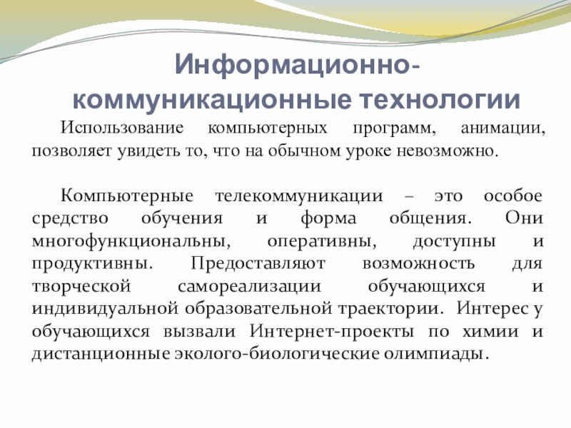 Компьютерные телекоммуникации – это особое средство обучения и форма общения. Они многофункциональны, оперативны, доступны и продуктивны. Предоставляют возможность для творческой самореализации обучающихся и индивидуальной образовательной траектории. Интерес у обучающихся вызвали Интернет-проекты по химии и дистанционные эколого-биологические олимпиады.