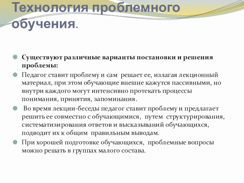 проблему и сам решает ее, излагая лекционный материал, при этом обучающие внешне кажутся пассивными, но внутри каждого могут интенсивно протекать процессы понимания, принятия, запоминания.