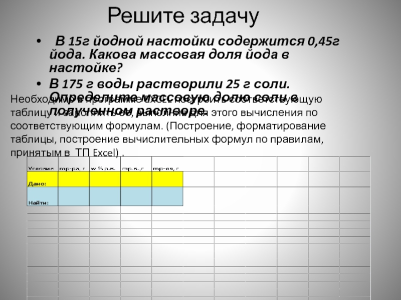 Необходимо в программе EXCEL построить соответствующую таблицу и заполнить ее, выполнив для этого вычисления по соответствующим формулам. (Построение, форматирование таблицы, построение вычислительных формул по правилам, принятым в ТП Excel) .