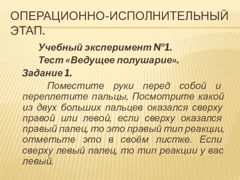 Поместите руки перед собой и переплетите пальцы, Посмотрите какой из двух больших пальцев оказался сверху правой или левой, если сверху оказался правый палец, то это правый тип реакции, отметьте это в своём листке. Если сверху левый палец, то тип реакции у вас левый.