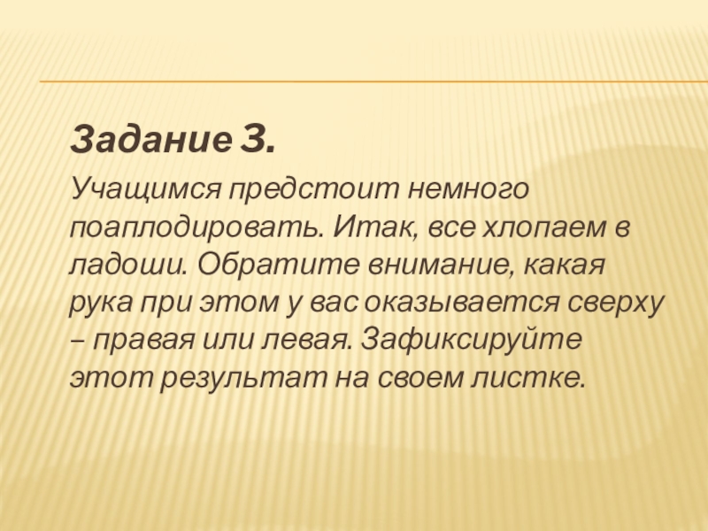 Итак, все хлопаем в ладоши. Обратите внимание, какая рука при этом у вас оказывается сверху – правая или левая. Зафиксируйте этот результат на своем листке.