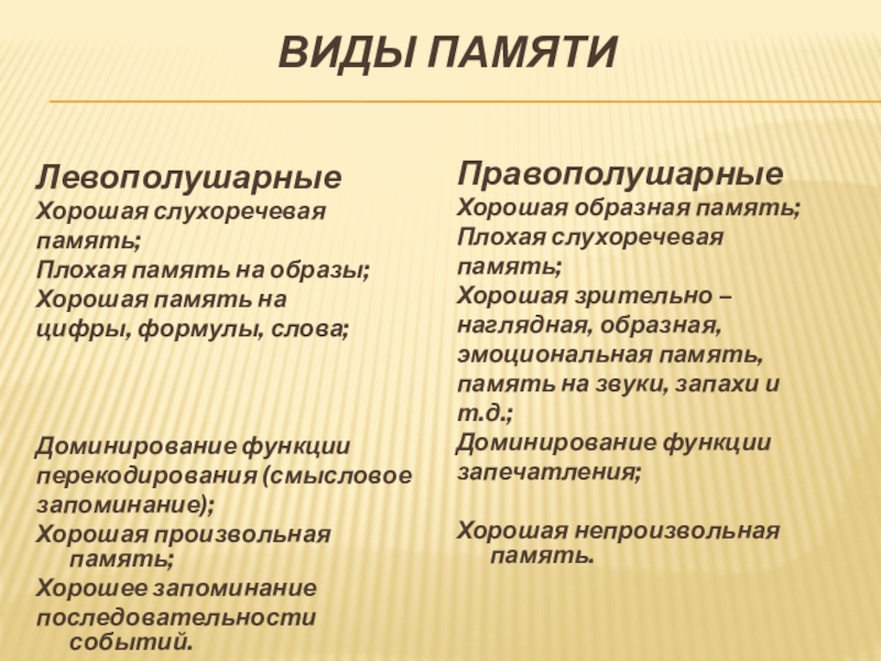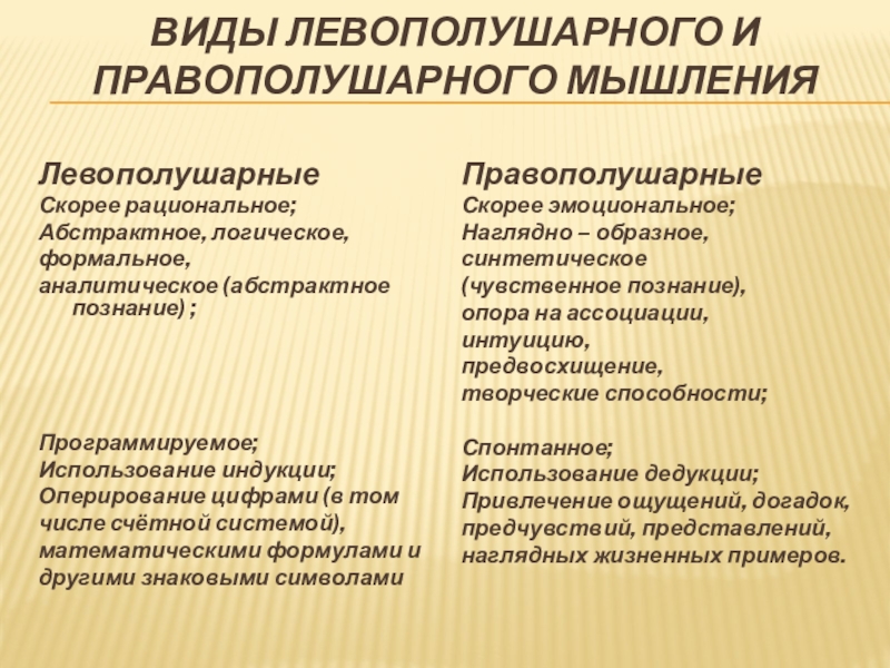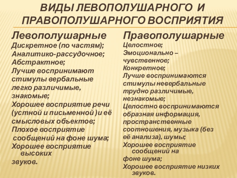 Слайд 9Виды левополушарного и правополушарного восприятия