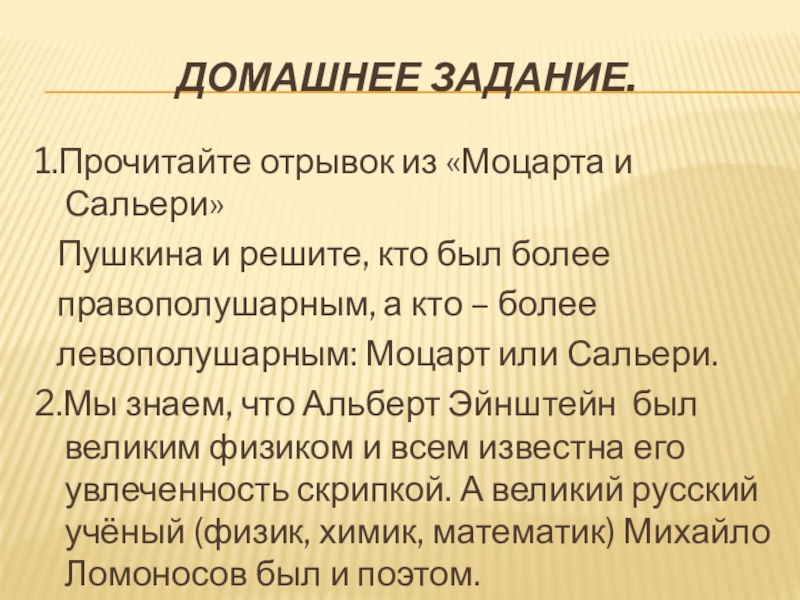 2.Мы знаем, что Альберт Эйнштейн был великим физиком и всем известна его увлеченность скрипкой. А великий русский учёный (физик, химик, математик) Михайло Ломоносов был и поэтом.