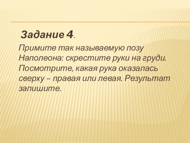 Наполеона: скрестите руки на груди. Посмотрите, какая рука оказалась сверху – правая или левая. Результат запишите.