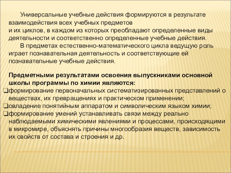 формирование умений устанавливать связи между реально наблюдаемыми химическими явлениями и процессами, происходящими в микромире, объяснять причины многообразия веществ, зависимость их свойств от состава и строения и др.